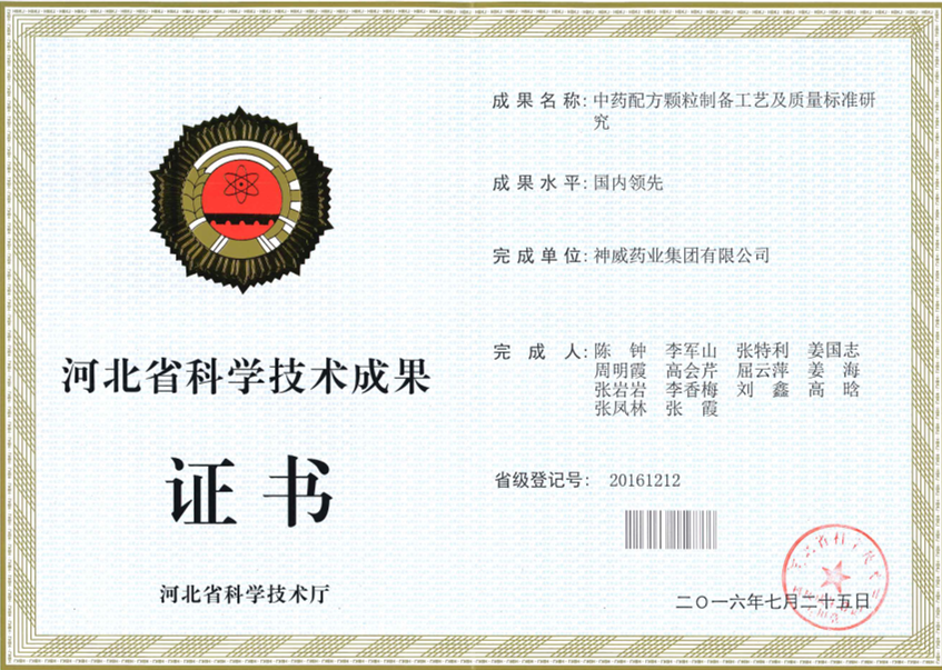 • K8官网药业于2014年承担河北省重大技术创新专项——“中药配方颗粒制备工艺及质量标准研究”,以K8官网药业首批50种常用中药配方颗粒为研究对象,根据饮片性质的不同建立不同的提取或制备工艺,并且将近红外检测技术应用于部分以溶剂提取的配方颗粒的生产过程中,判定提取终点,以保证配方颗粒的批间质量一致性。相关研究形成企业标准50件,申请专利2件,发表论文2篇,当年新增产值900万元。经河北省科技成果转化服务中心鉴定为国内领先水平。